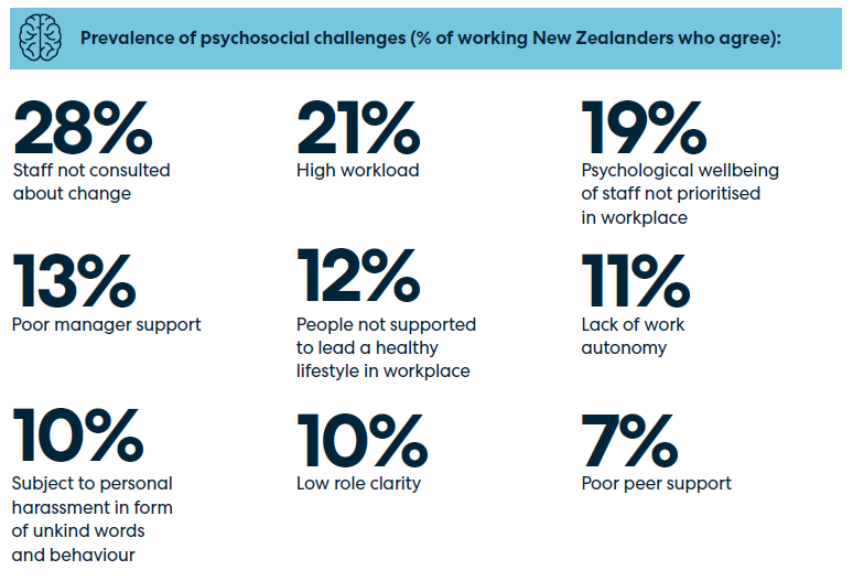 New analysis of data from more than 11,000 working New Zealanders shows that common workplace factors such as high workload, poor change processes, and low psychological safety significantly increase the risk of psychological distress, reduced performance, and ill health for employees.
